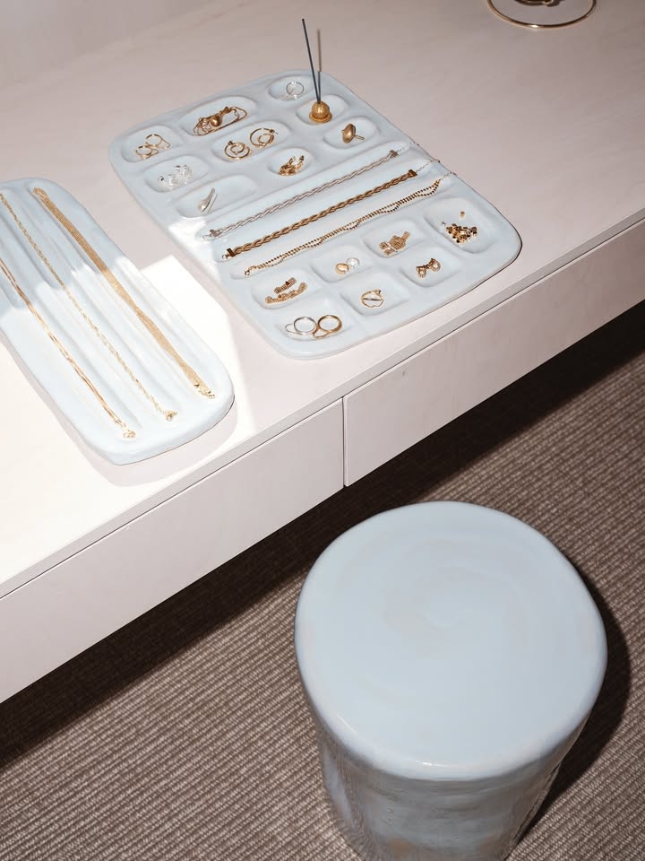 The collection includes handcrafted display trays and a sculptural stool, designed to complement the brand’s refined jewellery presentation. Subtle glazes in soft, ethereal hues reflect the lightness and fluidity of Maggoosh’s aesthetic, while the tactile quality of stoneware introduces a sense of warmth and material depth to the interior.