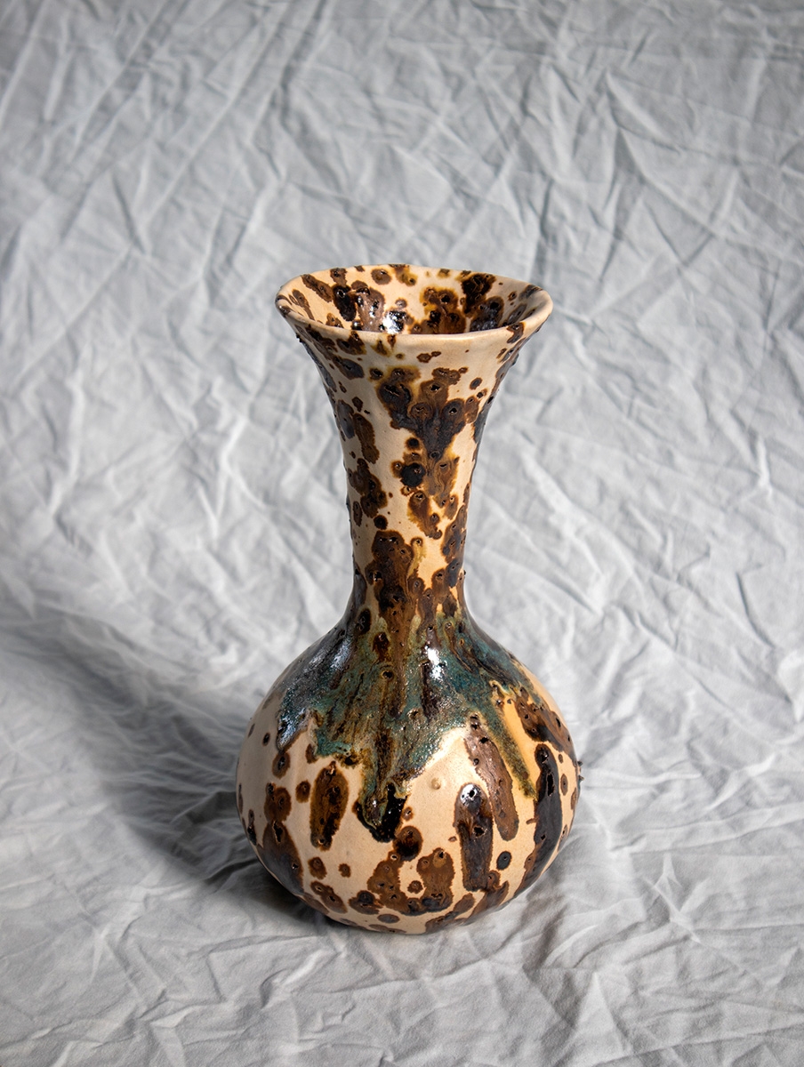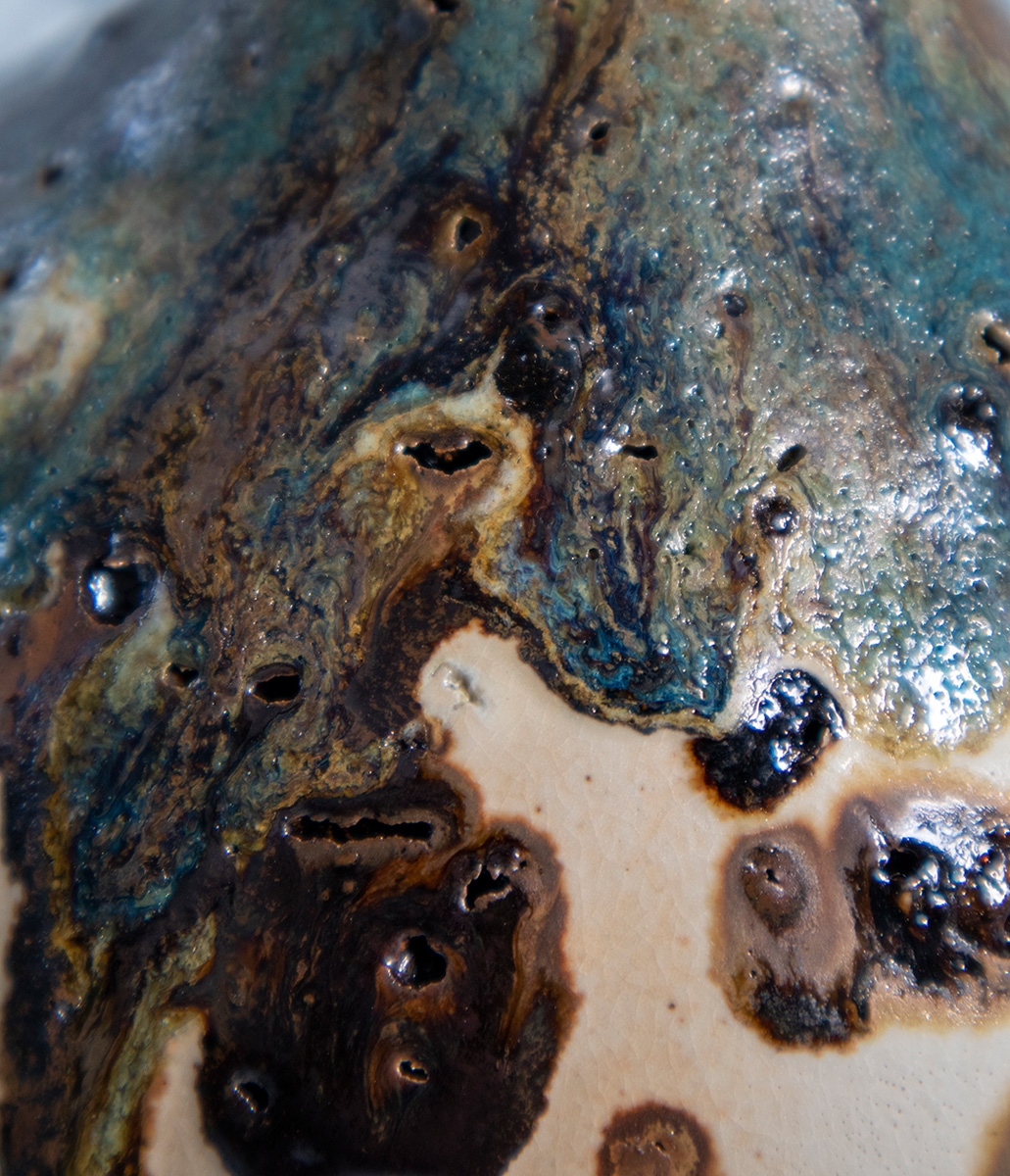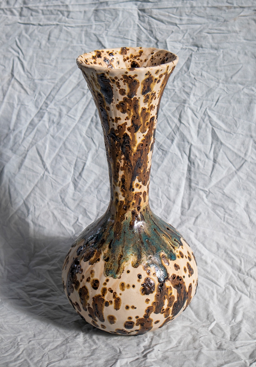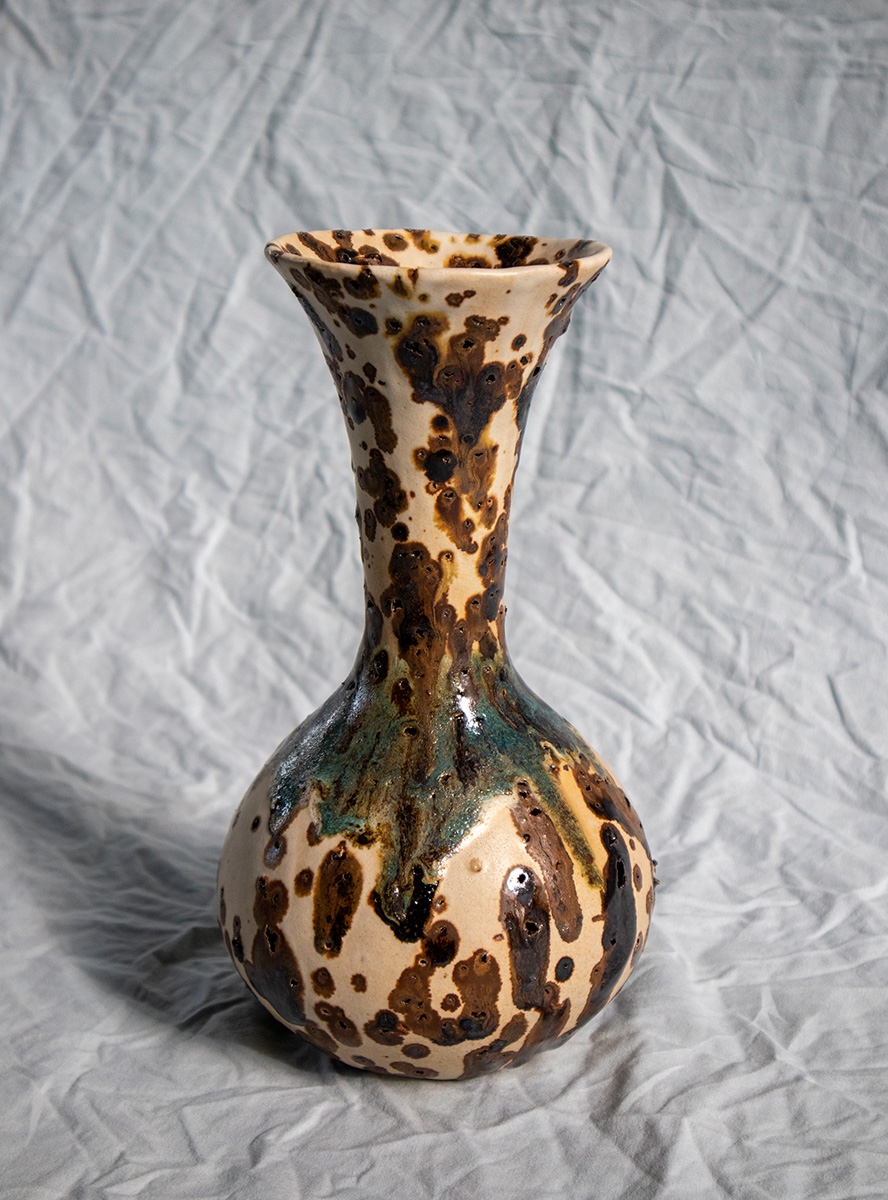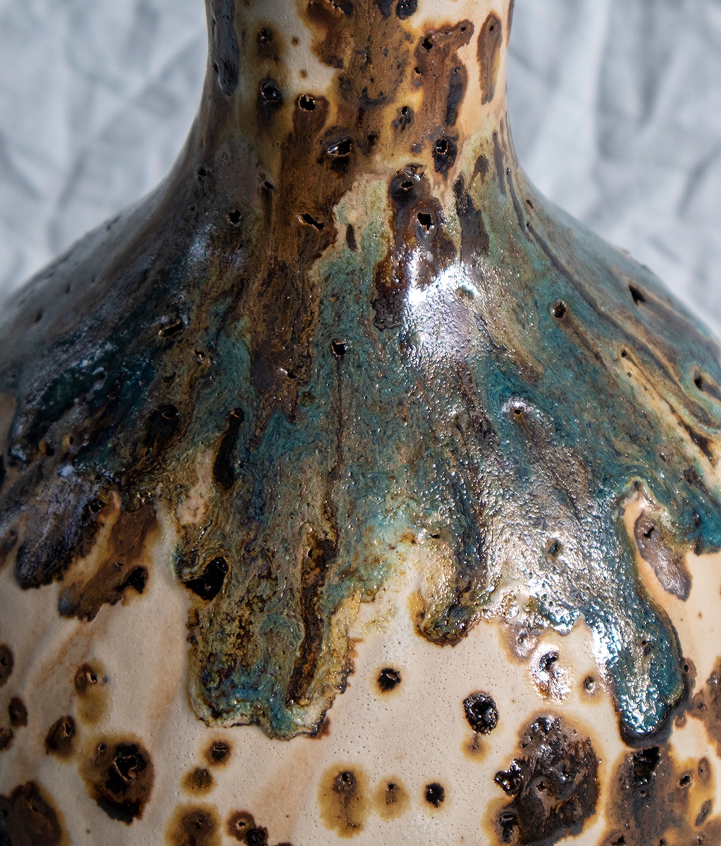 Handbuild vessel with the coiling method. Beige stoneware clay mixed with volcano rocks. Glazed with white matte glaze and experimental glazes with vine ashes and copper. High fired at cone 7.