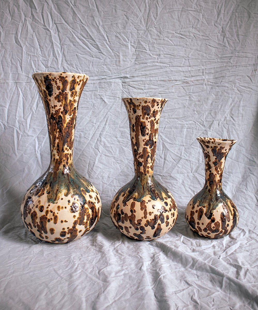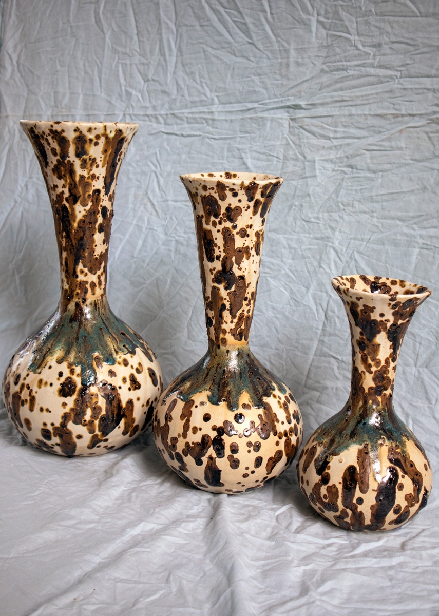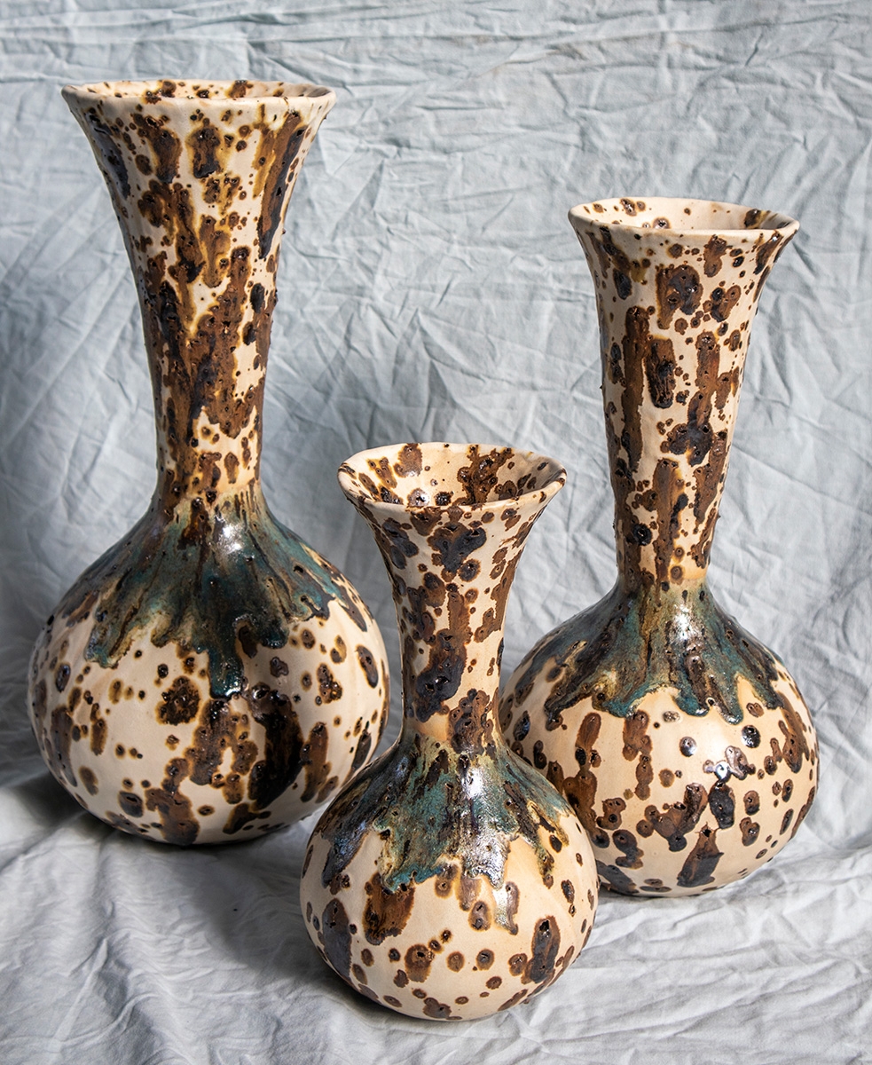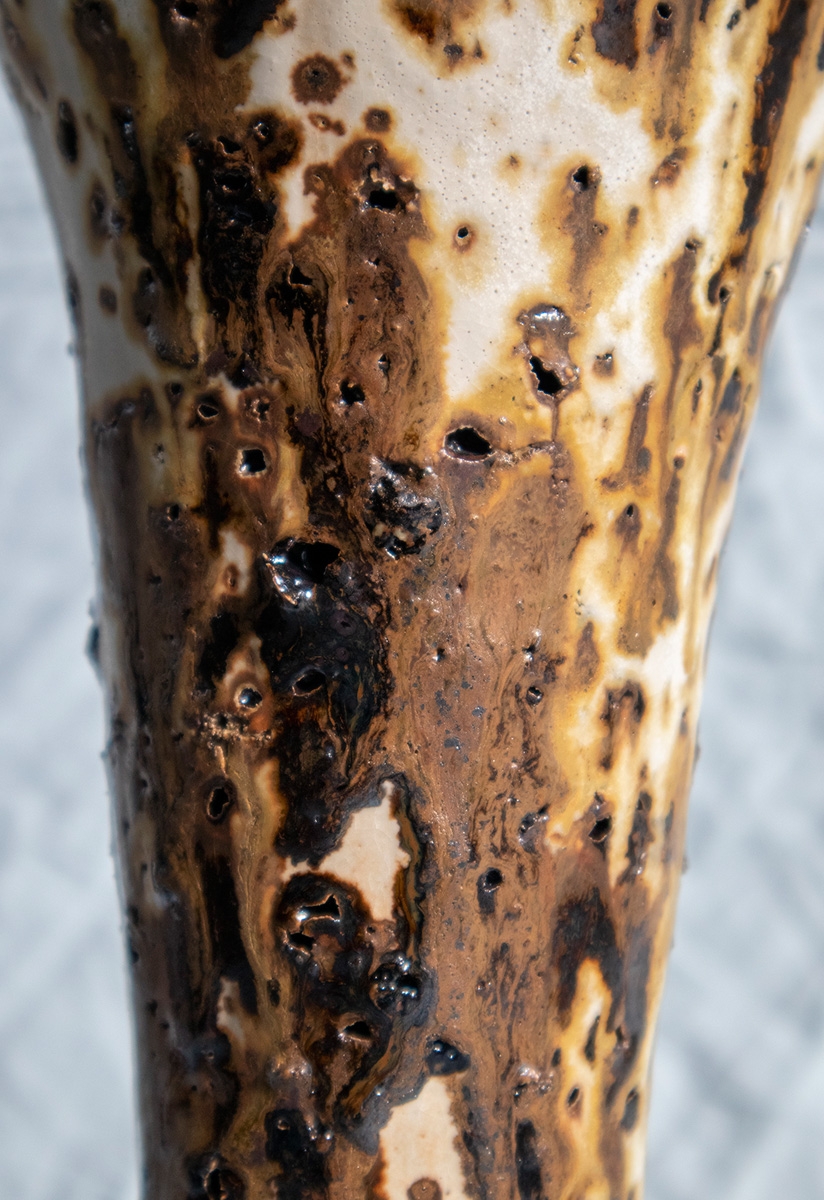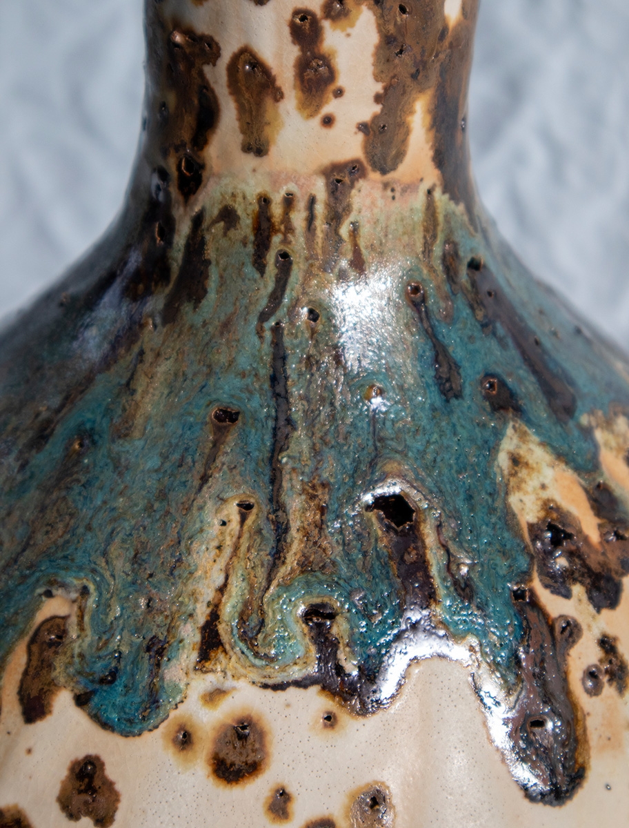 Handbuild vessel with the coiling method. Beige stoneware clay mixed with volcano rocks. Glazed with white matte glaze and experimental glazes with vine ashes and copper. High fired at cone 7.
